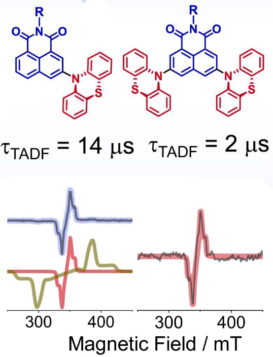 состояние 1CS, темное состояние 3CS и локализованное на хромофоре состояние 3LE, которое необходимо для опосредования перехода из состояния 3CS в излучательное состояние 1CS. Мы первые в 2019 году наблюдали одновременно спектры от двух триплетов и инверсию поляризации электронных спинов триплета с разделенными зарядами в TADF диадах. В 2025 году методом ВРЭПР выполнено детальное исследование ряда TADF излучателей на основе новых компактных D-А диад, показано, что спектры ВРЭПР являются суммой спектров двух триплетов, вклады от которых изменяются от состава диад, увеличение вклада от локализованного триплета коррелирует с увеличением времени TADF. Впервые показана роль механизма формирования локализованного триплета на эффективность TADF. Наблюдаемая инверсия электронной спиновой поляризации состояния 3CS при длительных задержках и зависимость эффекта от температуры являются убедительным и прямым экспериментальным доказательством механизма спин-вибронной связи TADF.